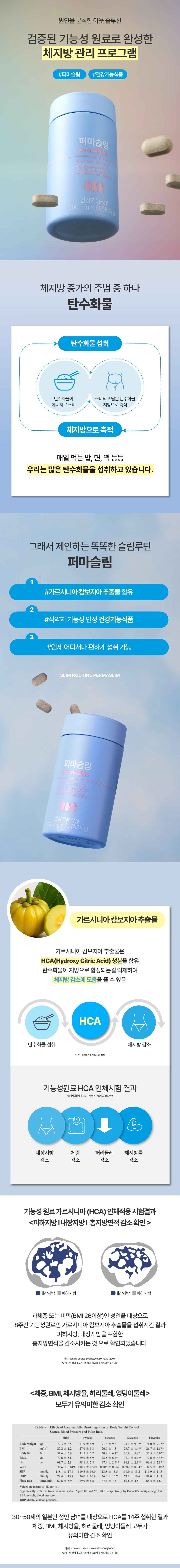 가르시니아캄보지아추출물 (인도산), 미강혼합분말 (국산), 알로에추출물분말 (남프리카공화국), 무수구연산, 프락토올리고당, 치커리뿌리추출물분말 (벨기에), 결정셀룰로스, 녹차분말, 건조맥주효모, 탄산수소나트륨, 핑거루트분말, 이산화규소, 비타민C, 생선콜라갠